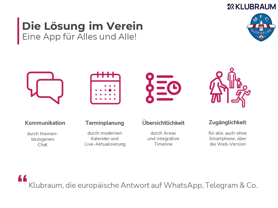 Für die vereinsinterne Kommunikation verwenden wir den DSGVO-konformen Dienst Klubraum, der als App- und Browser-Version verfügbar ist.